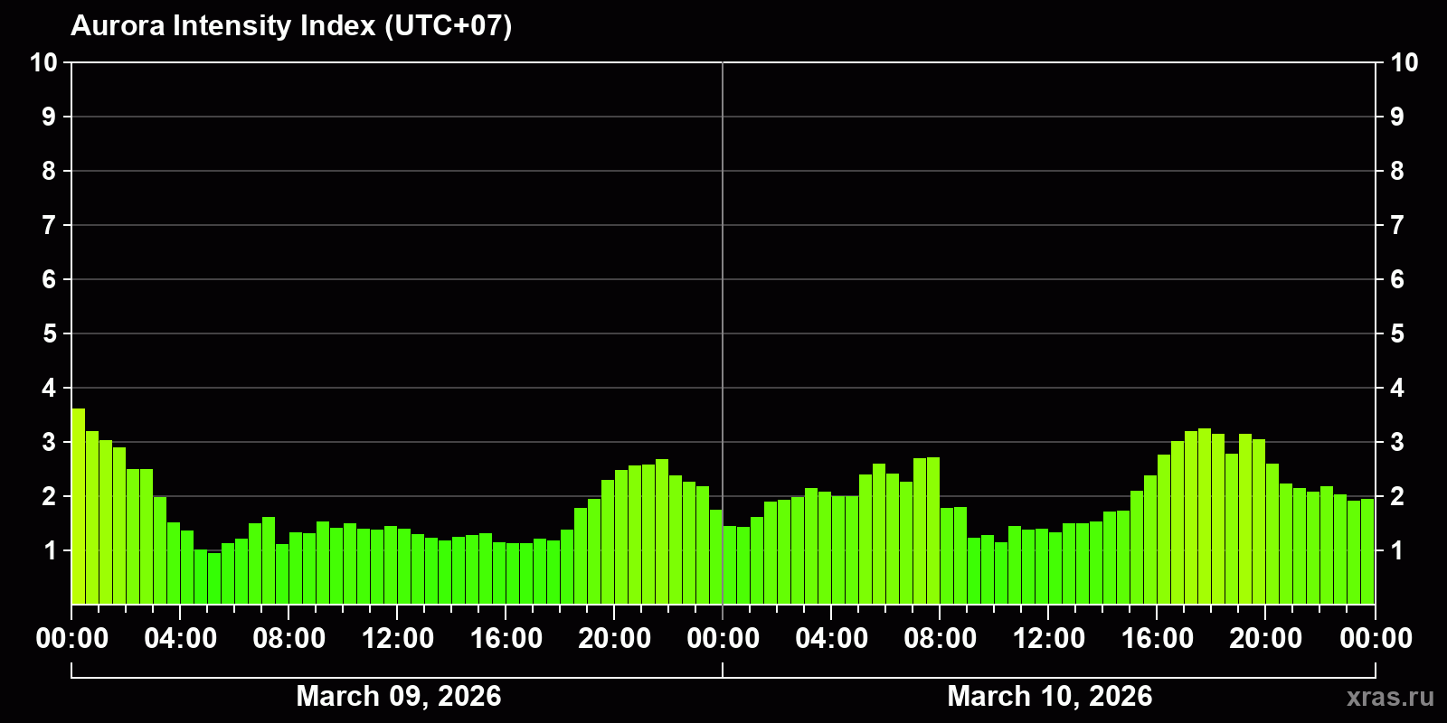 Auroral intensity index and the theoretically possible latitude of observations for nighttime in the Estern Hemisphere as of 2026-03-10 23:48 (end of day) local time