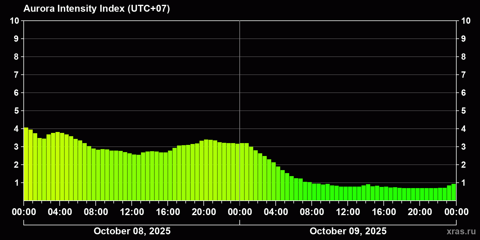 Auroral intensity index and the theoretically possible latitude of observations for nighttime in the Estern Hemisphere as of 2025-10-09 23:56 (end of day) local time