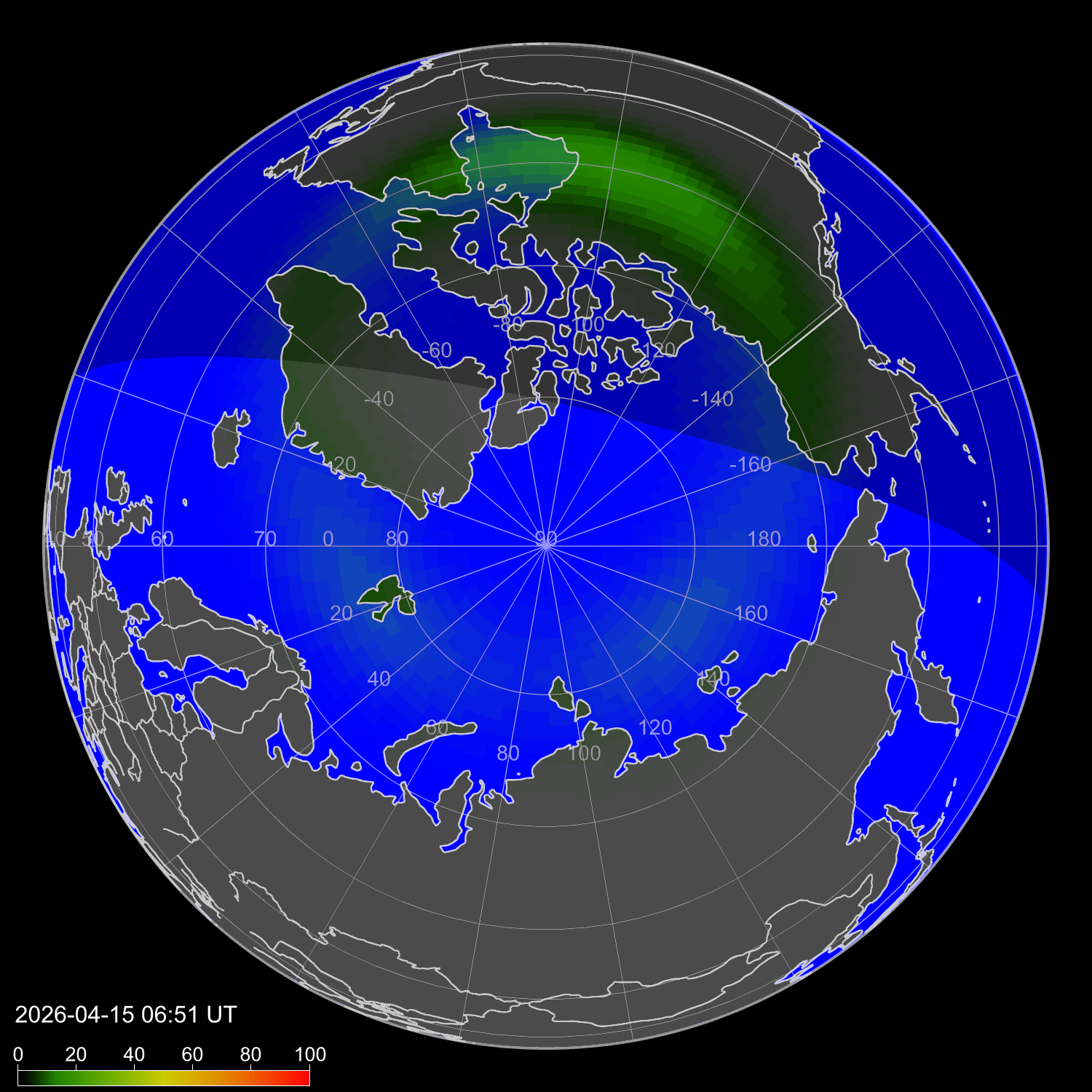 Изменения и часовой прогноз индекса интенсивности полярных сияний с 2026-04-15 по 2026-04-16