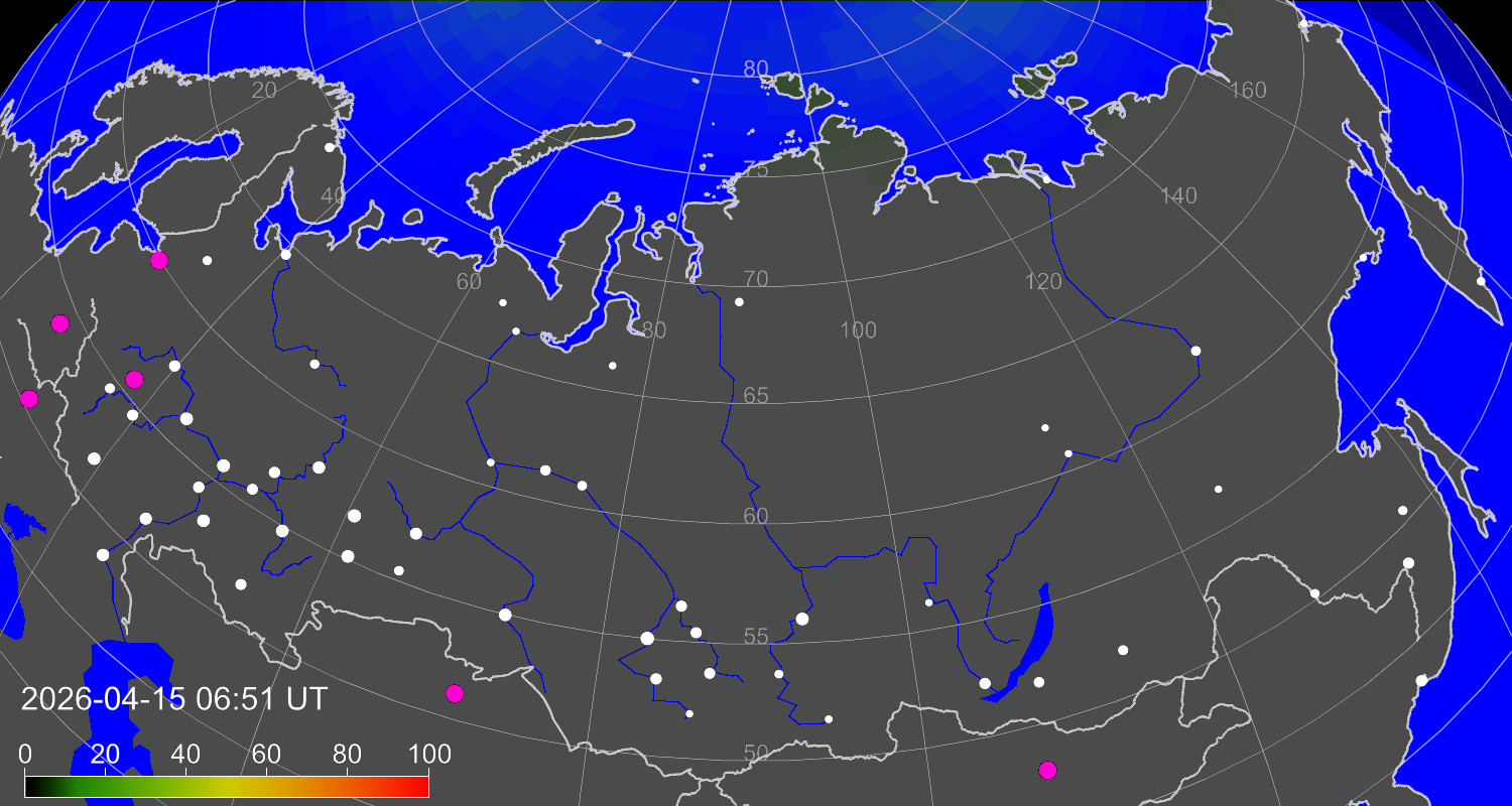 Индекс интенсивности полярных сияний и теоретически возможная широта наблюдений для ночного времени в восточном полушарии