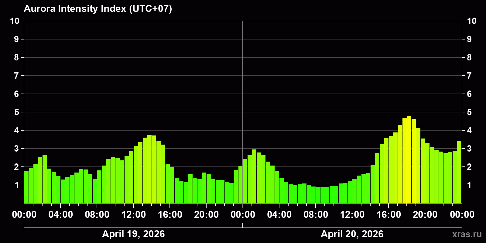 Changes in the auroral intensity index from 2026-04-19 to 2026-04-20 local time