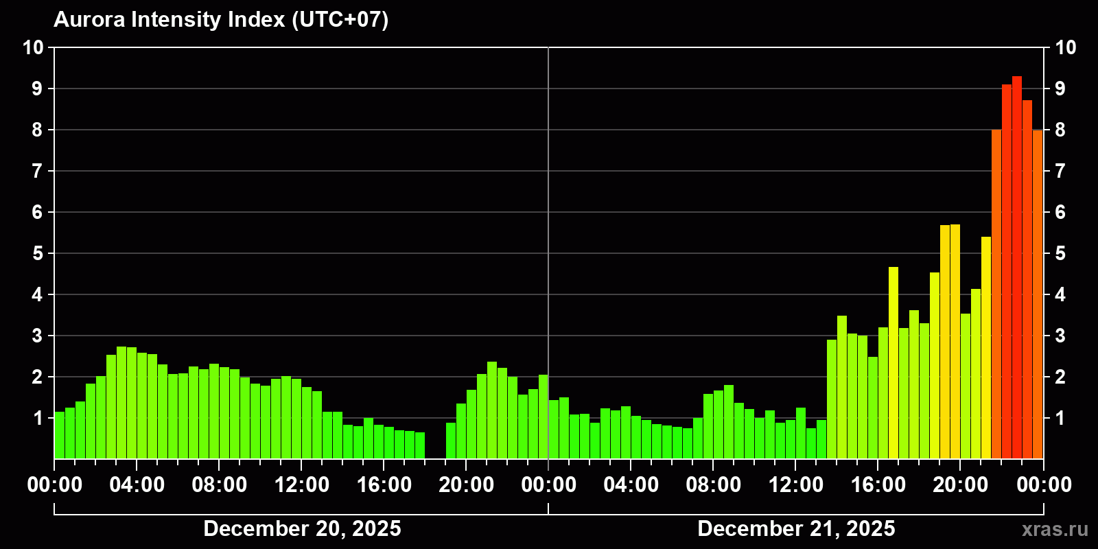 Auroral intensity index and the theoretically possible latitude of observations for nighttime in the Estern Hemisphere as of 2025-12-21 23:49 (end of day) local time