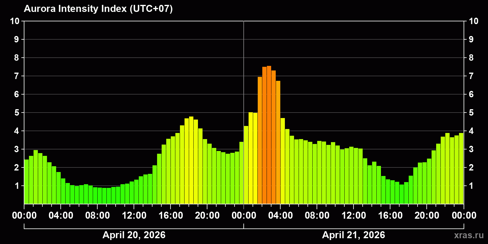 Changes in the auroral intensity index from 2026-04-20 to 2026-04-21 local time