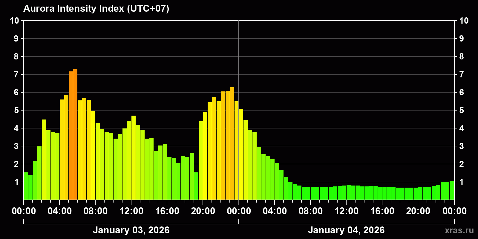 Auroral intensity index and the theoretically possible latitude of observations for nighttime in the Estern Hemisphere as of 2026-01-04 23:53 (end of day) local time