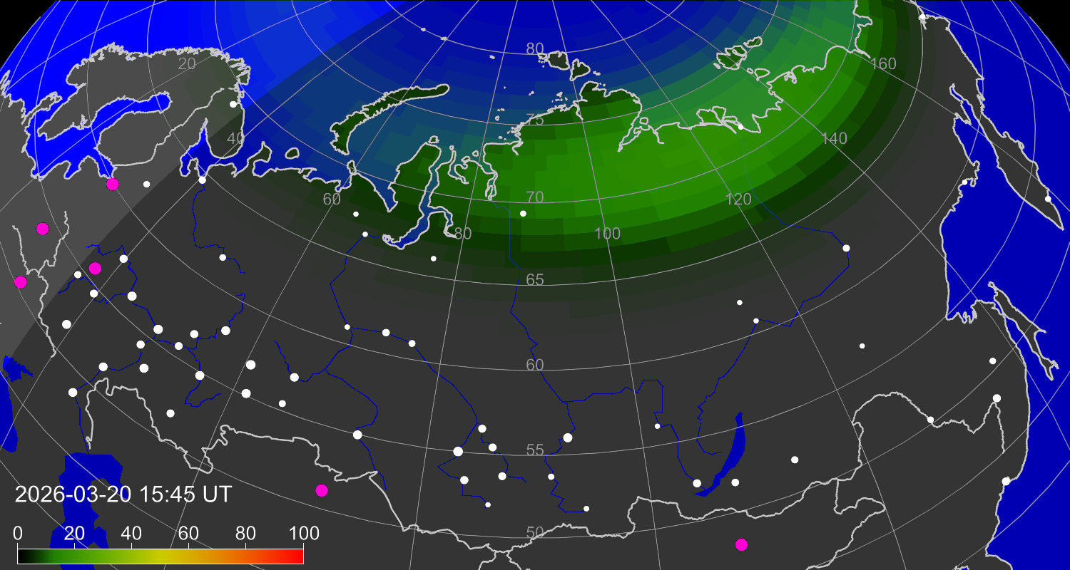 Вероятность полярных сияний в городах Российской Федерации