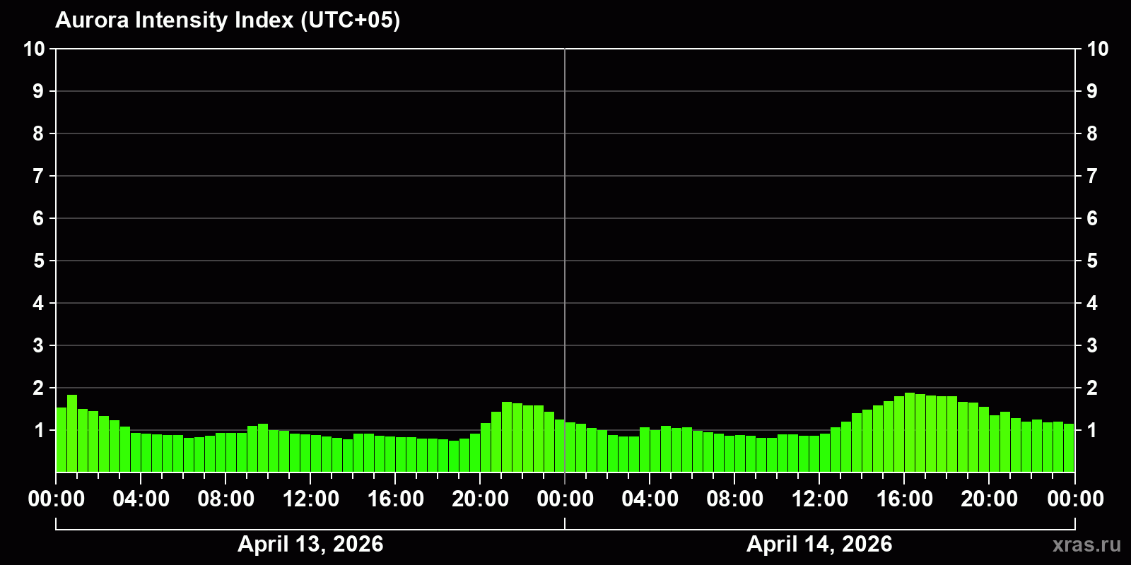 Changes in the auroral intensity index from 2026-04-13 to 2026-04-14 local time