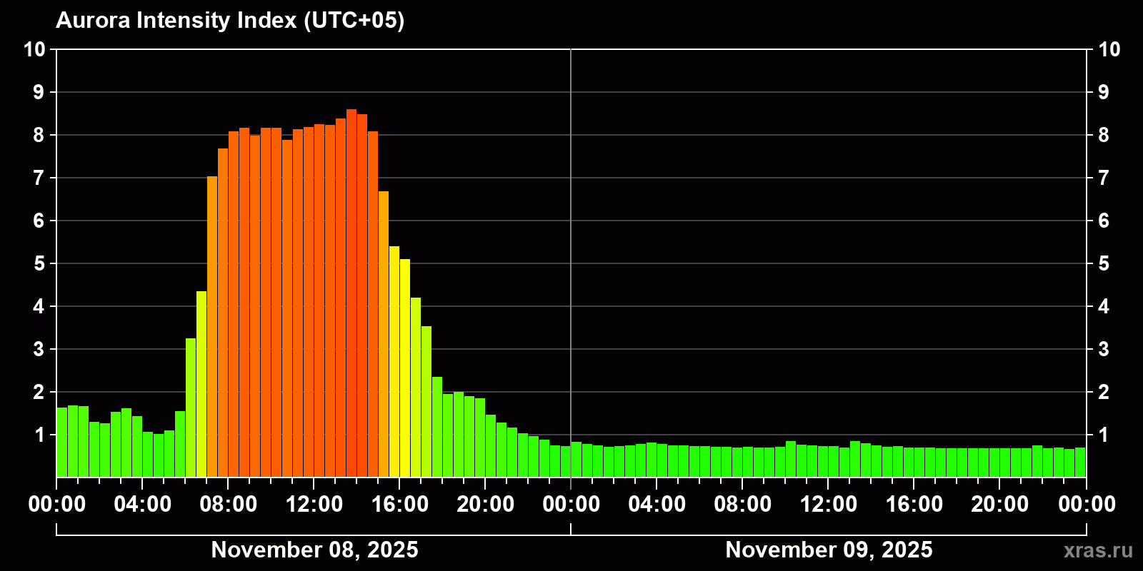 Changes in the auroral intensity index from 2025-11-08 to 2025-11-09 local time