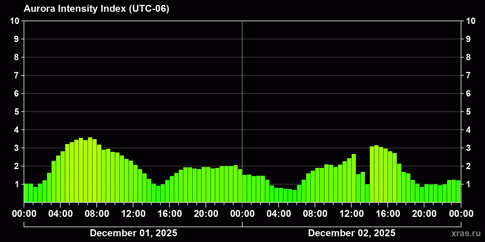 Auroral intensity index and the theoretically possible latitude of observations for nighttime in the Western Hemisphere as of 2025-12-02 23:52 (end of day) local time