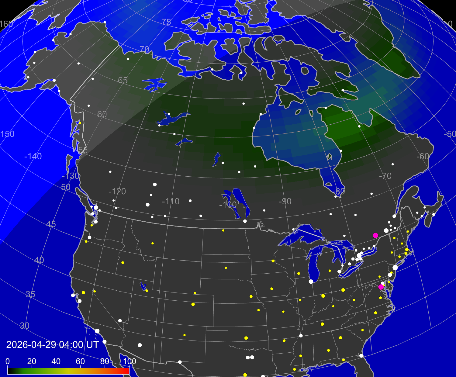 Probability of northern lights (auroras) in cities of United States