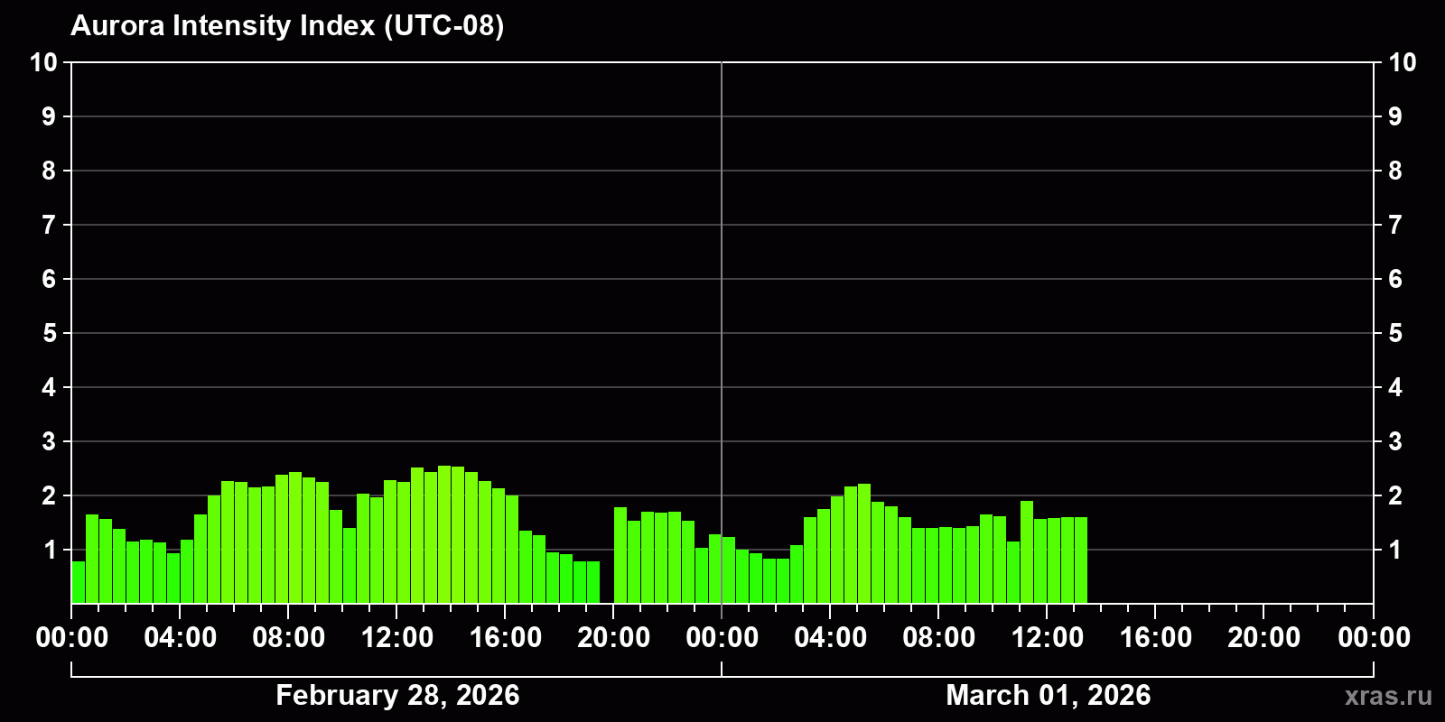Changes in the auroral intensity index from 2026-02-28 to 2026-03-01 local time