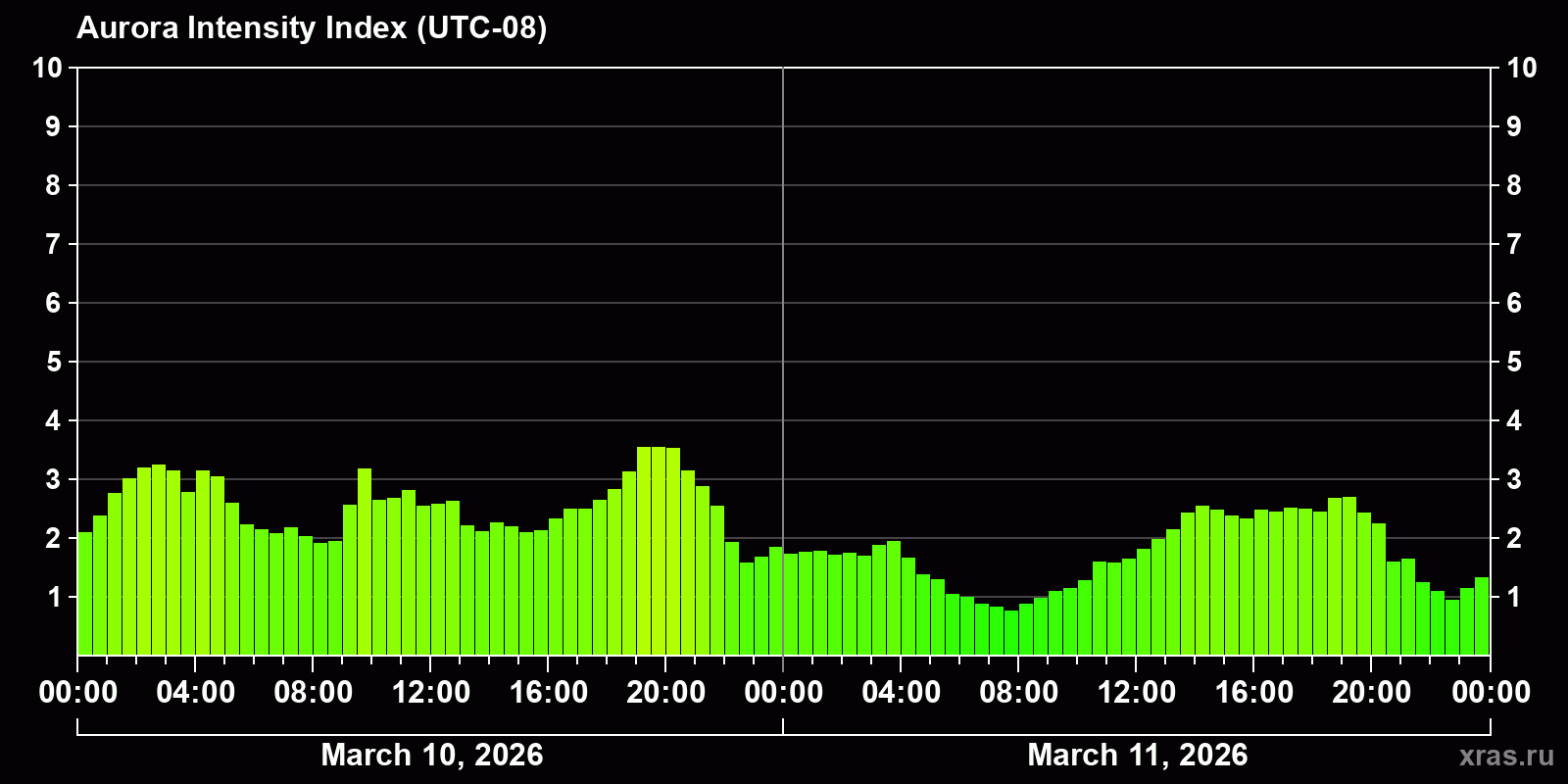 Changes in the auroral intensity index from 2026-03-10 to 2026-03-11 local time