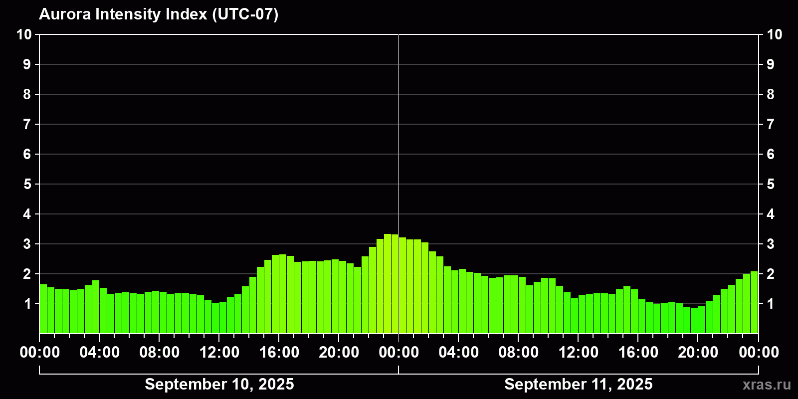 Auroral intensity index and the theoretically possible latitude of observations for nighttime in the Western Hemisphere as of 2025-09-11 23:48 (end of day) local time