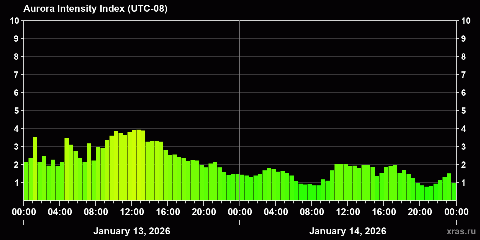 Changes in the auroral intensity index from 2026-01-13 to 2026-01-14 local time