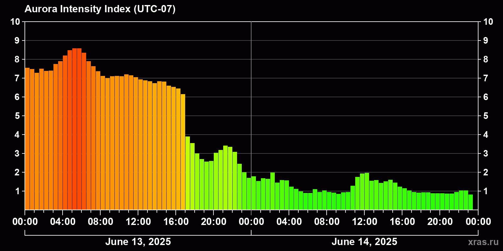 Changes in the auroral intensity index from 2025-06-13 to 2025-06-14 local time