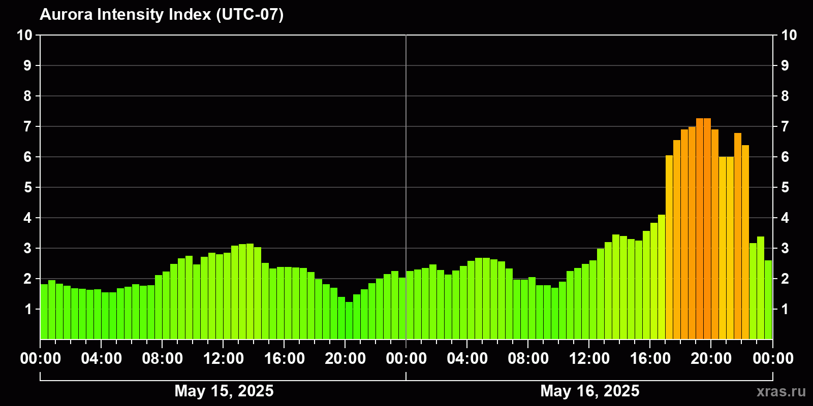 Auroral intensity index and the theoretically possible latitude of observations for nighttime in the Western Hemisphere as of 2025-05-16 23:46 (end of day) local time