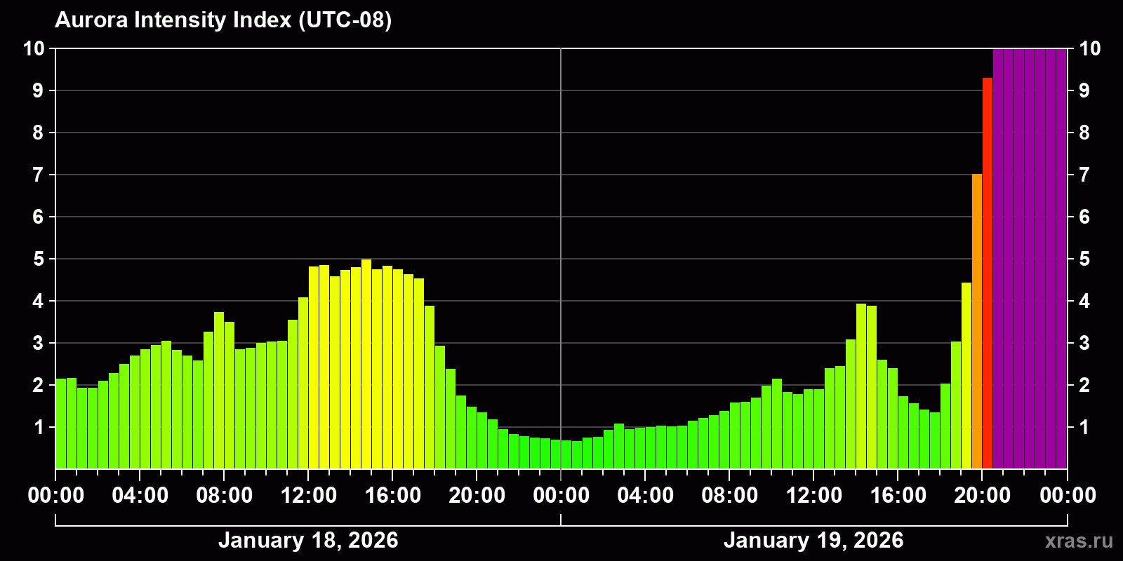 Auroral intensity index and the theoretically possible latitude of observations for nighttime in the Western Hemisphere as of 2026-01-19 23:47 (end of day) local time