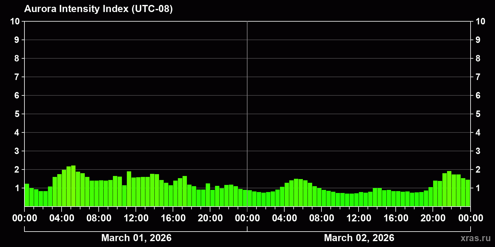 Changes in the auroral intensity index from 2026-03-01 to 2026-03-02 local time