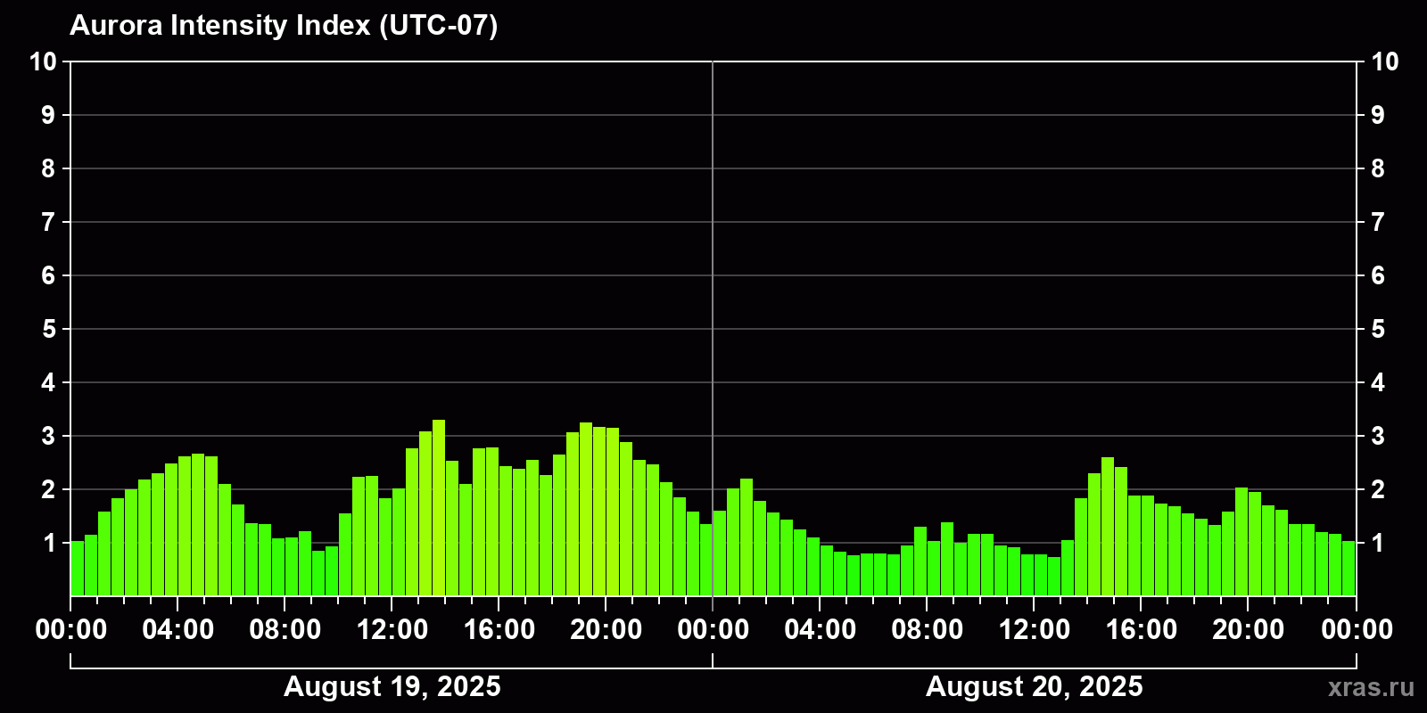 Auroral intensity index and the theoretically possible latitude of observations for nighttime in the Western Hemisphere as of 2025-08-20 23:47 (end of day) local time
