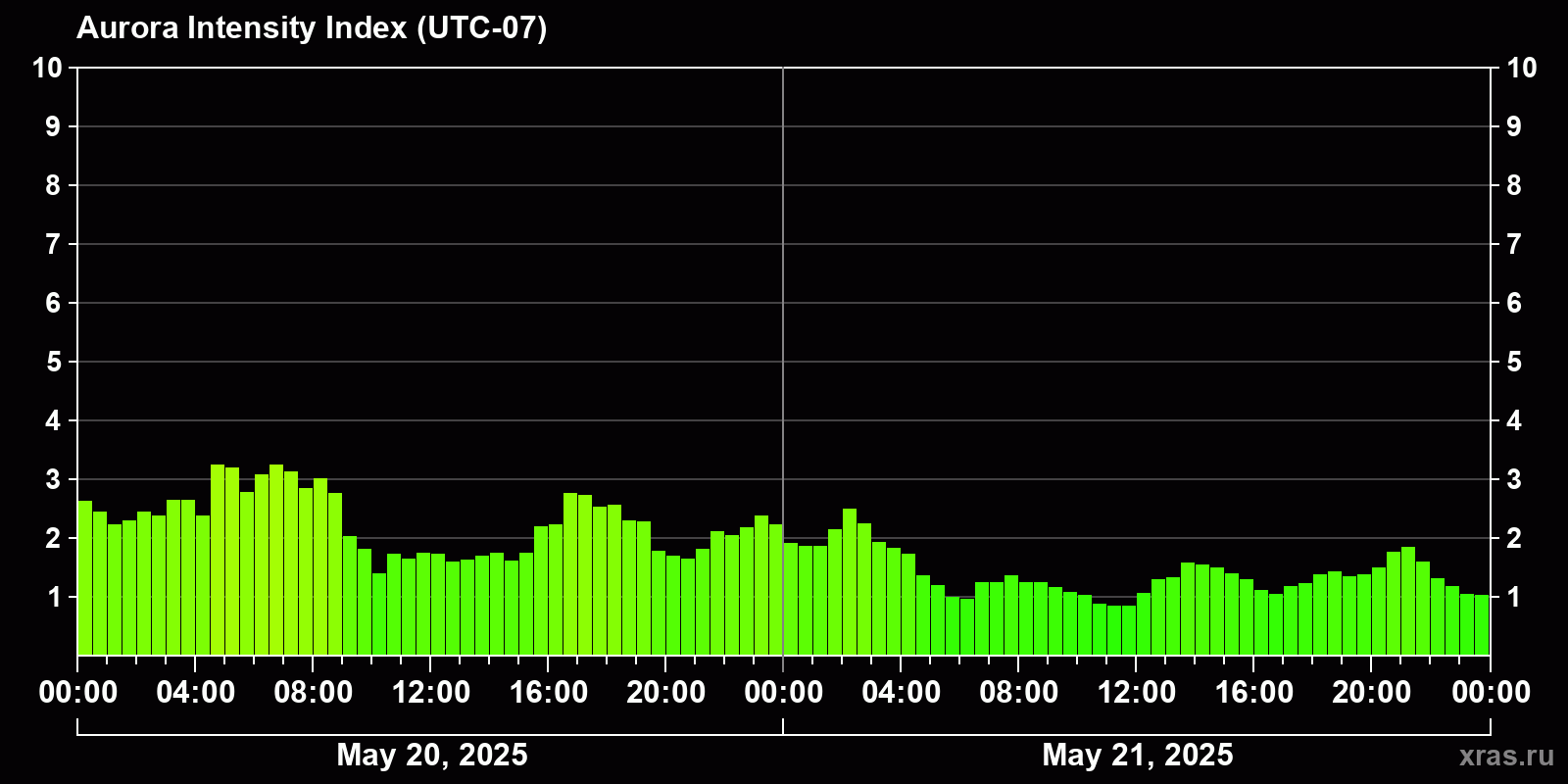 Auroral intensity index and the theoretically possible latitude of observations for nighttime in the Western Hemisphere as of 2025-05-21 23:58 (end of day) local time