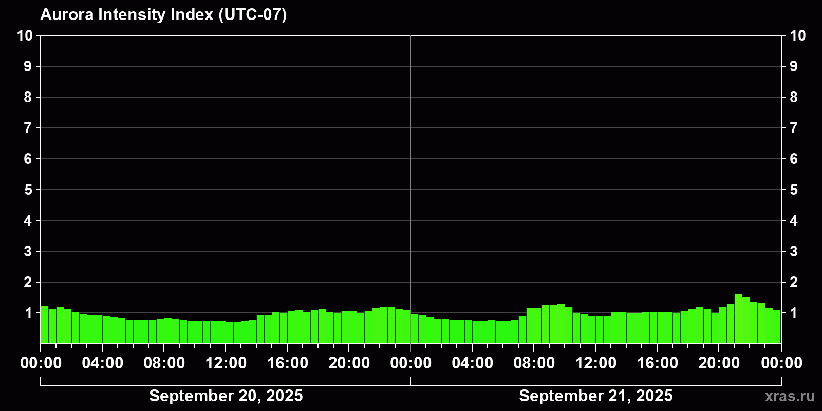 Auroral intensity index and the theoretically possible latitude of observations for nighttime in the Western Hemisphere as of 2025-09-21 23:54 (end of day) local time