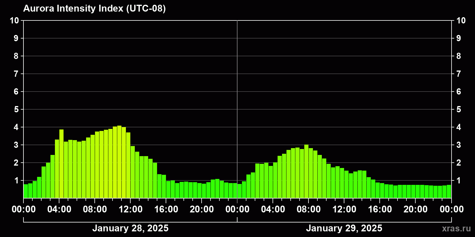 Changes in the auroral intensity index from 2025-01-28 to 2025-01-29 local time