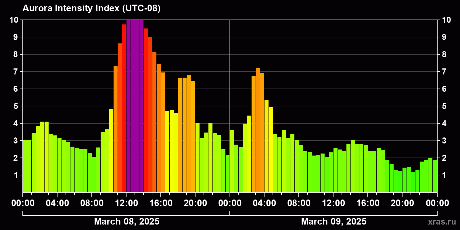 Changes in the auroral intensity index from 2025-03-08 to 2025-03-09 local time