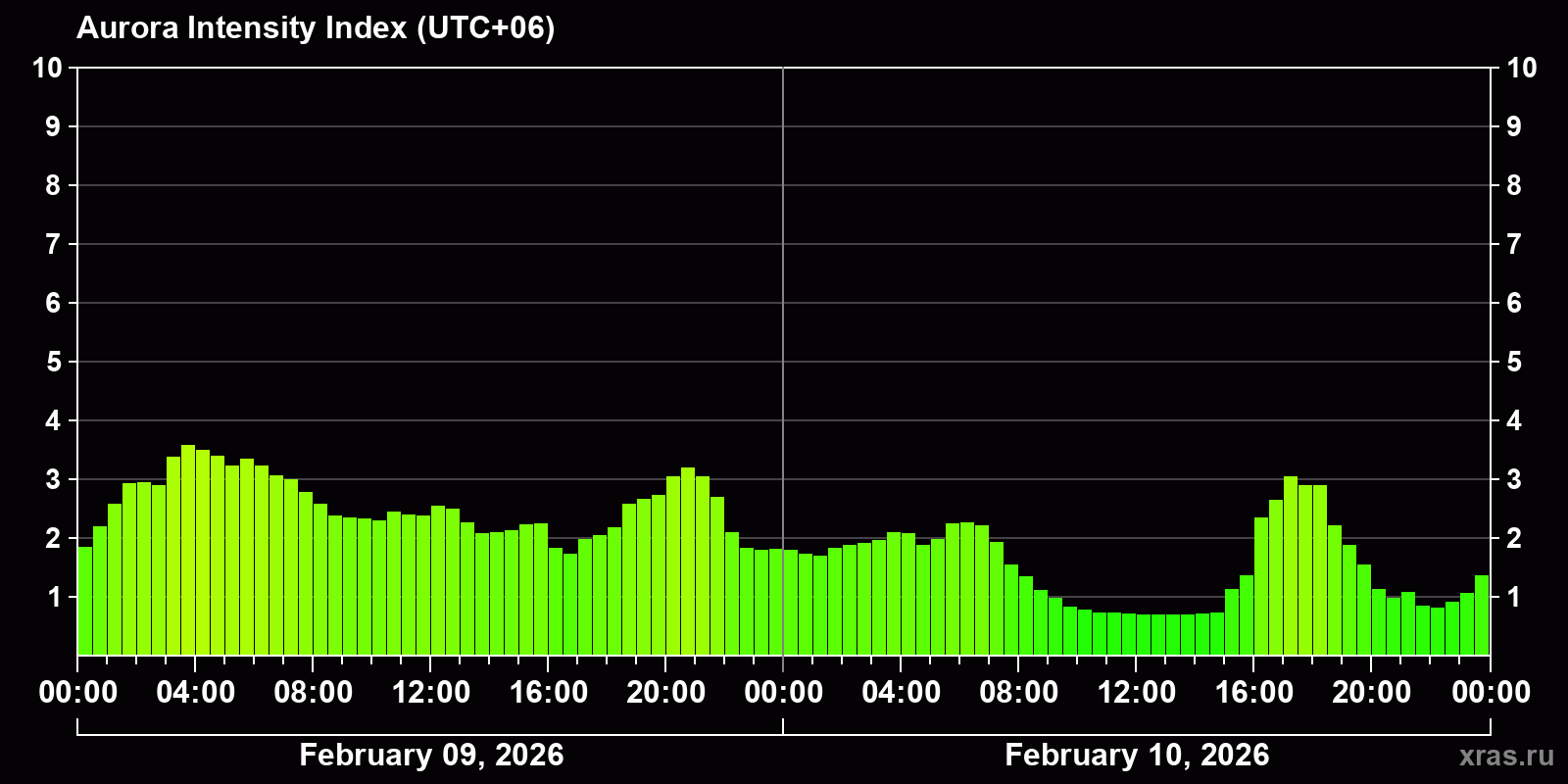 Auroral intensity index and the theoretically possible latitude of observations for nighttime in the Estern Hemisphere as of 2026-02-10 23:55 (end of day) local time