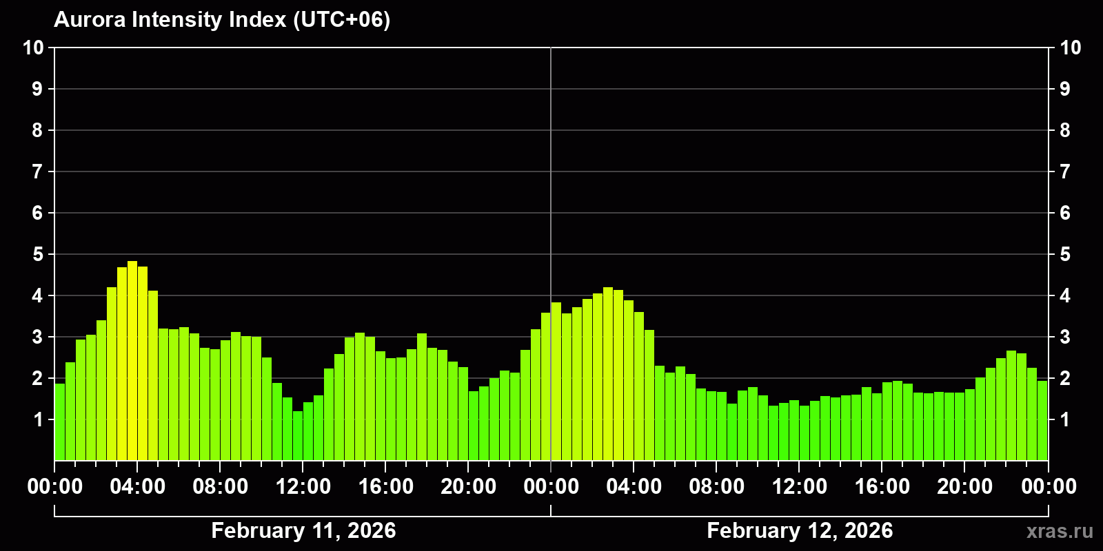 Auroral intensity index and the theoretically possible latitude of observations for nighttime in the Estern Hemisphere as of 2026-02-12 23:57 (end of day) local time