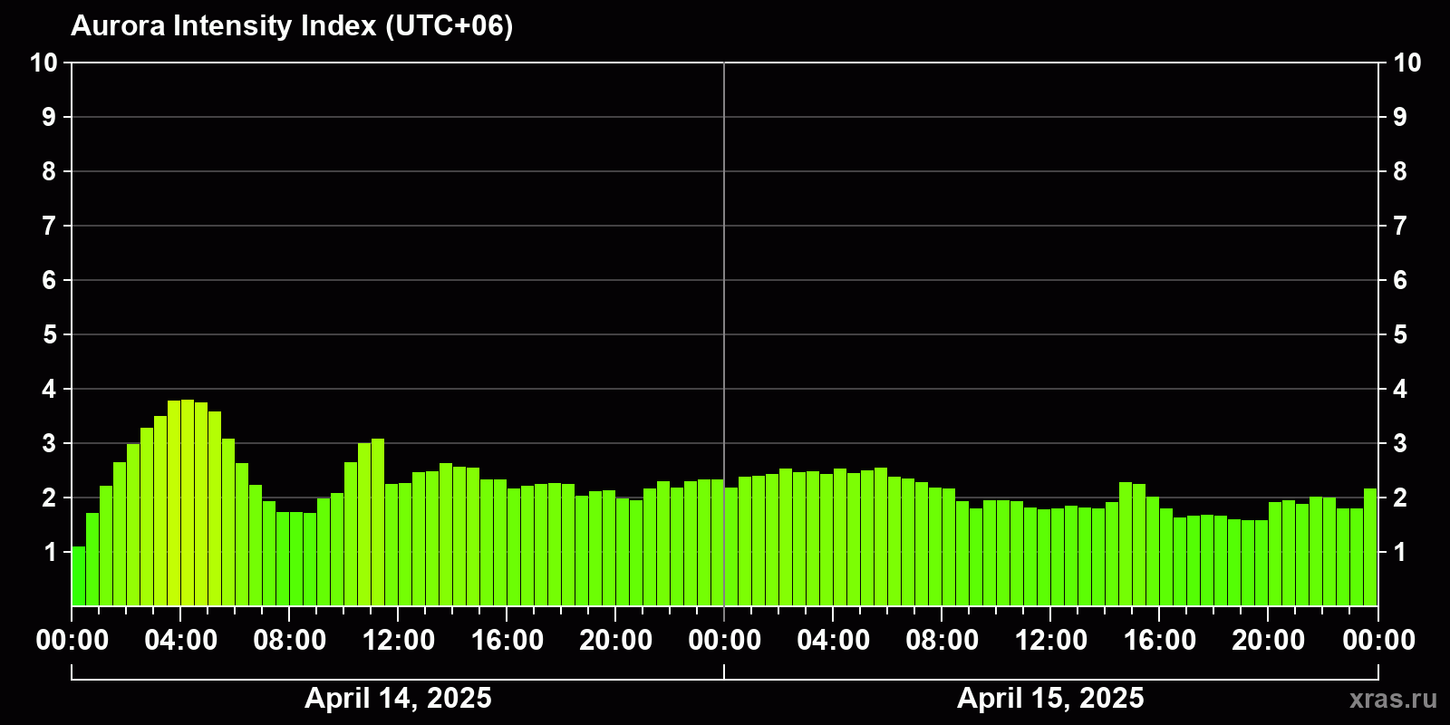 Changes in the auroral intensity index from 2025-04-14 to 2025-04-15 local time