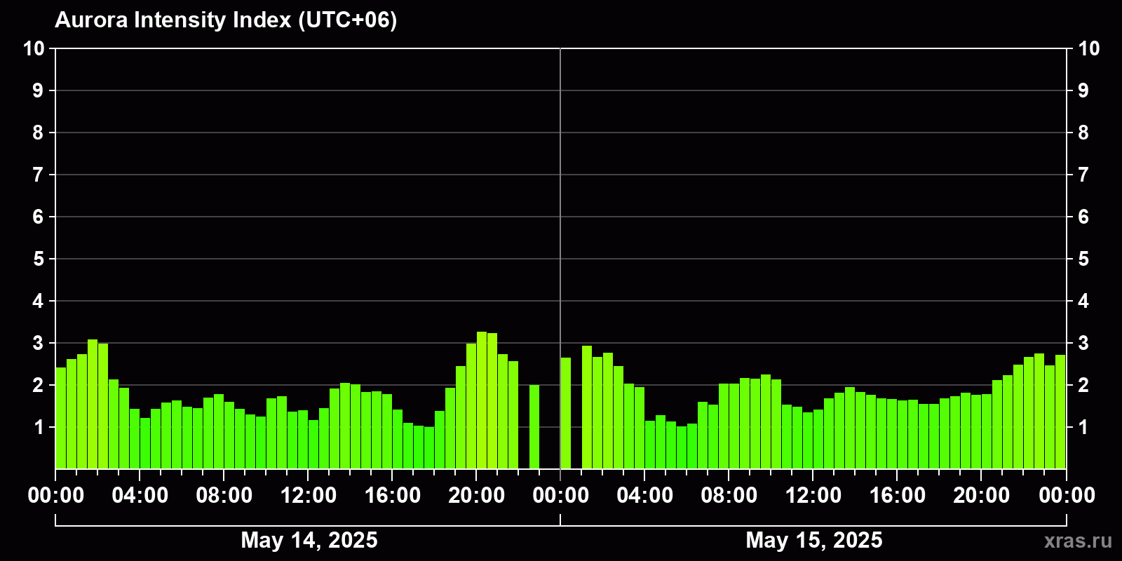 Auroral intensity index and the theoretically possible latitude of observations for nighttime in the Estern Hemisphere as of 2025-05-15 23:51 (end of day) local time