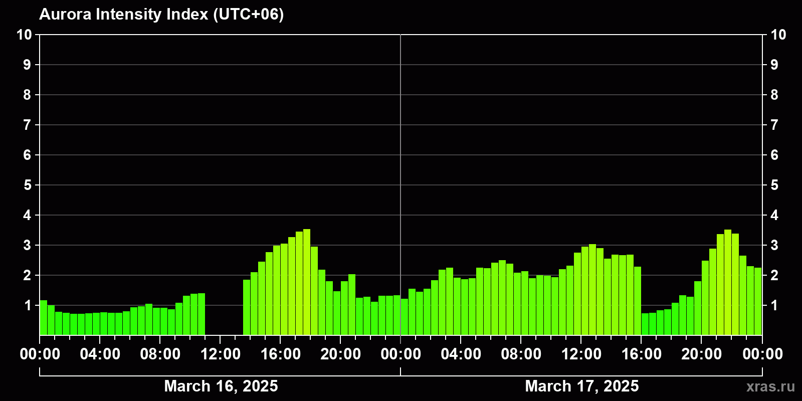 Changes in the auroral intensity index from 2025-03-16 to 2025-03-17 local time