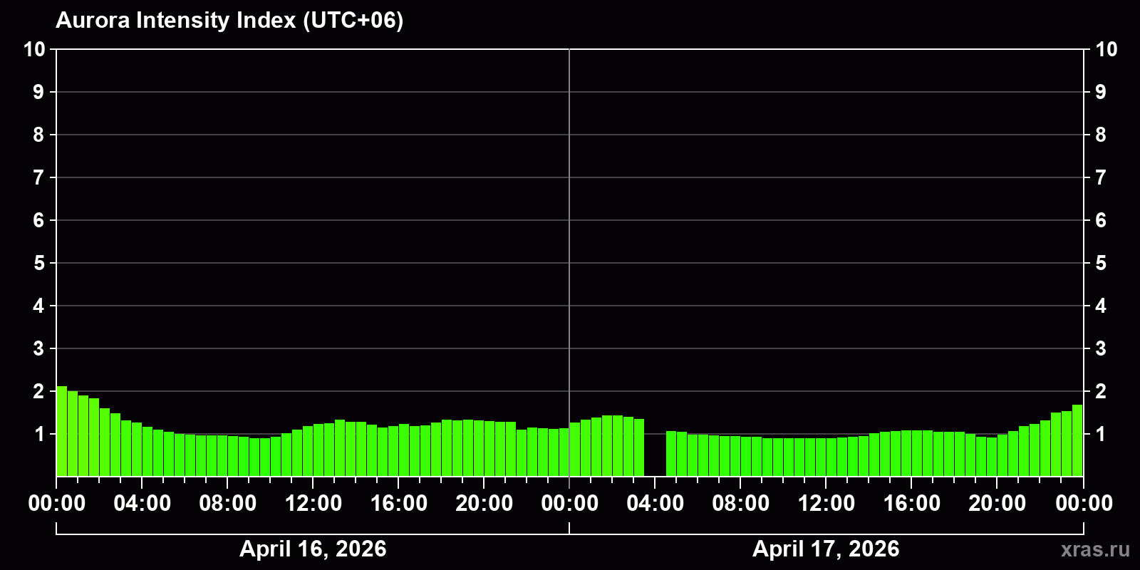 Changes in the auroral intensity index from 2026-04-16 to 2026-04-17 local time