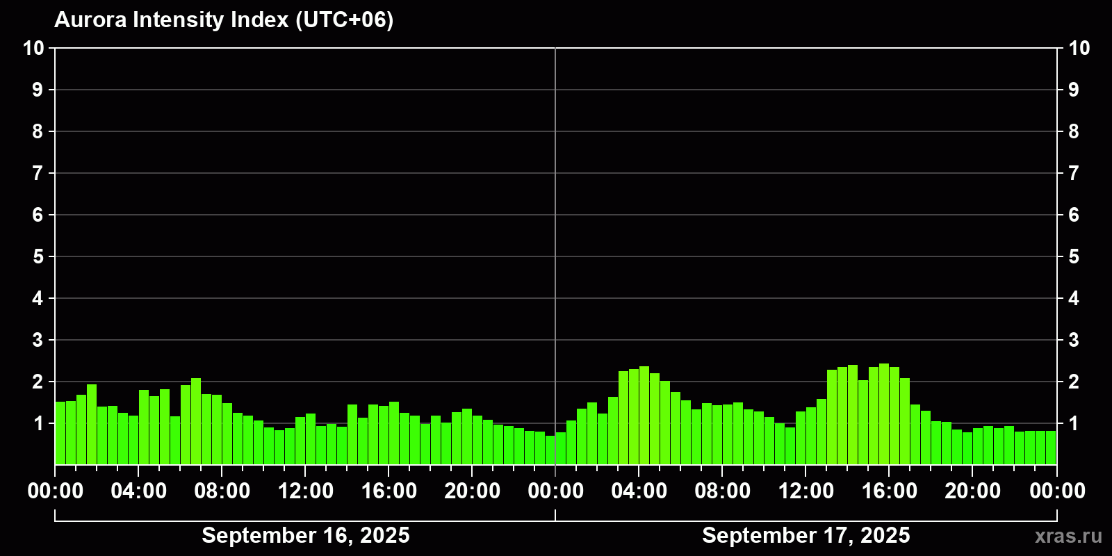 Changes in the auroral intensity index from 2025-09-16 to 2025-09-17 local time