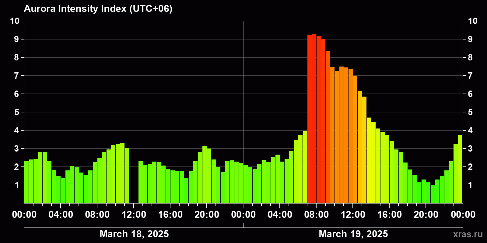 Changes in the auroral intensity index from 2025-03-18 to 2025-03-19 local time