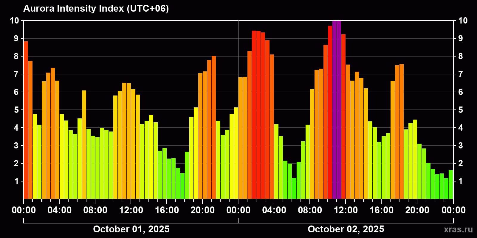 Changes in the auroral intensity index from 2025-10-01 to 2025-10-02 local time