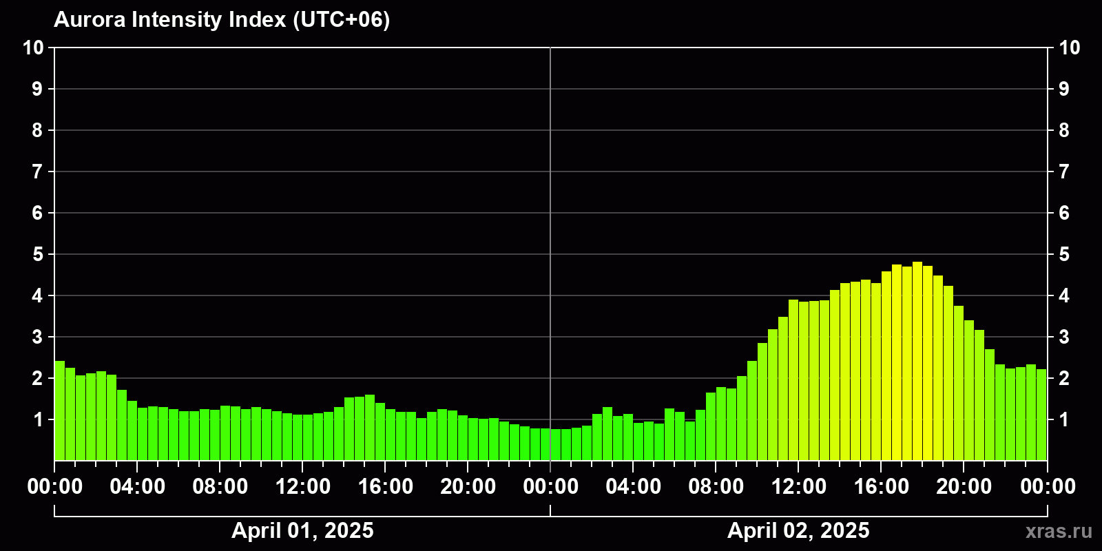 Changes in the auroral intensity index from 2025-04-01 to 2025-04-02 local time