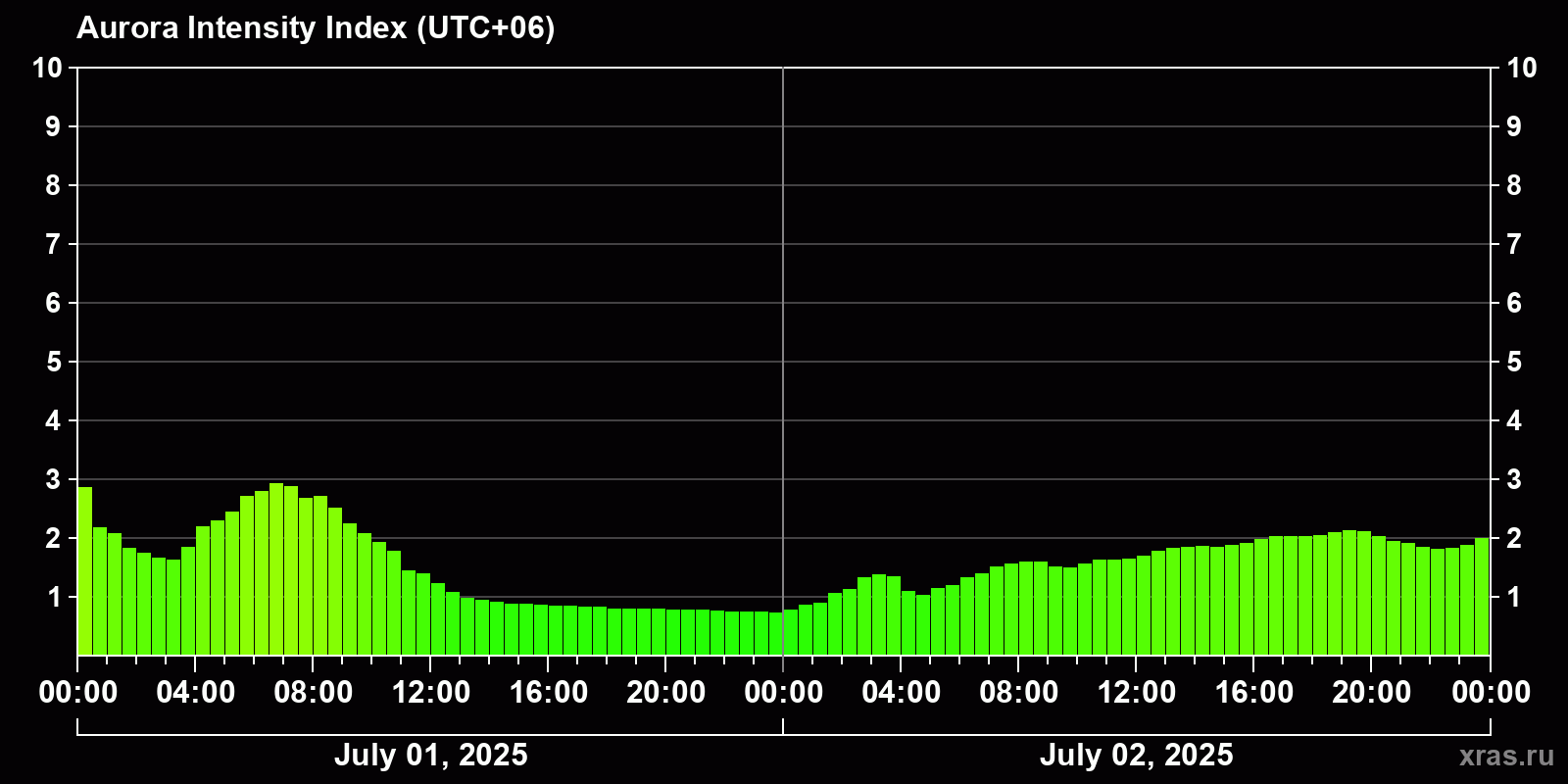Changes in the auroral intensity index from 2025-07-01 to 2025-07-02 local time