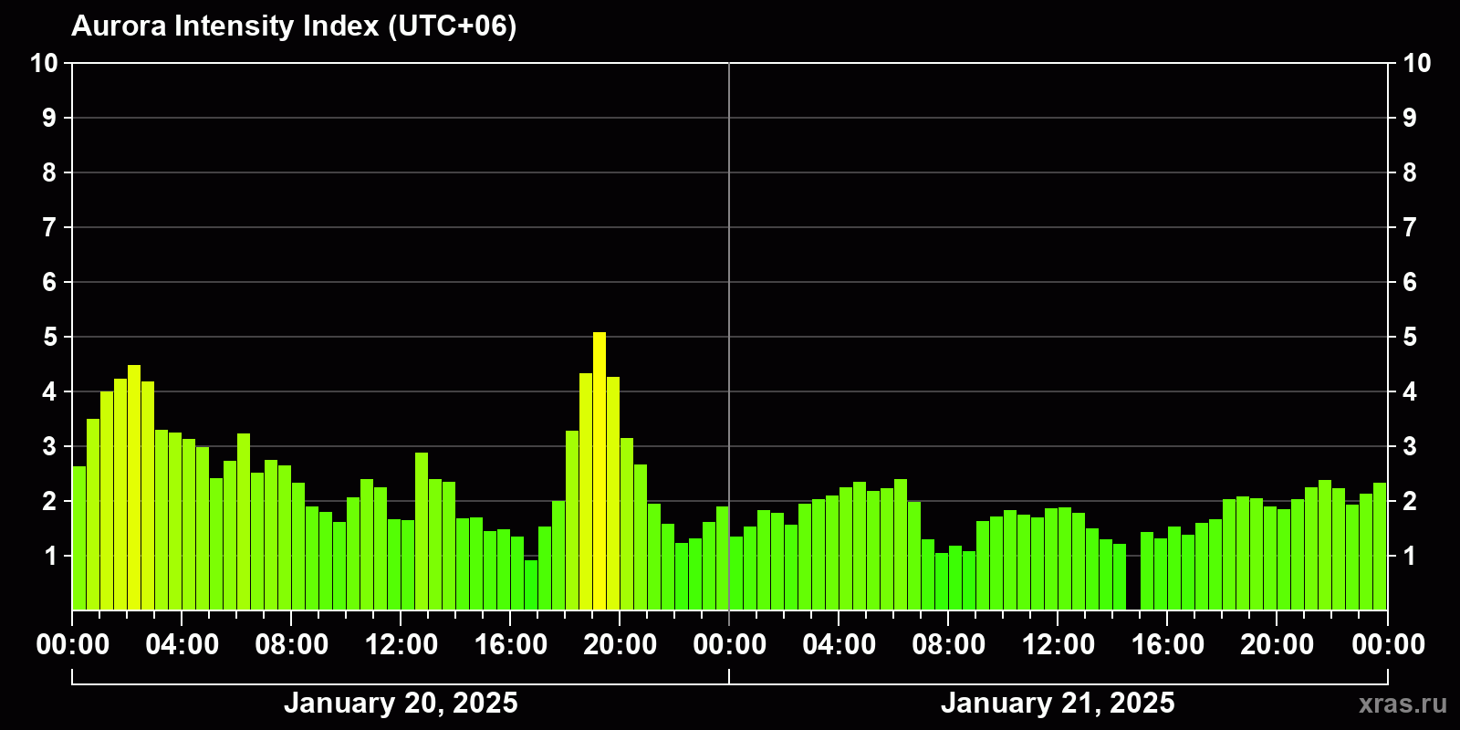 Changes in the auroral intensity index from 2025-01-20 to 2025-01-21 local time