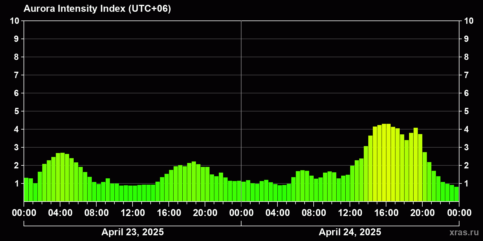 Auroral intensity index and the theoretically possible latitude of observations for nighttime in the Estern Hemisphere as of 2025-04-24 23:52 (end of day) local time