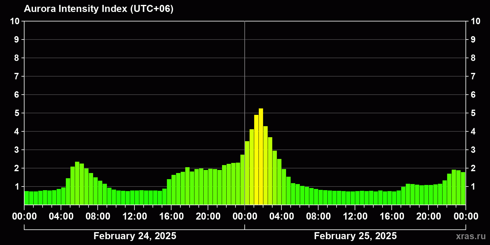 Auroral intensity index and the theoretically possible latitude of observations for nighttime in the Estern Hemisphere as of 2025-02-25 23:55 (end of day) local time