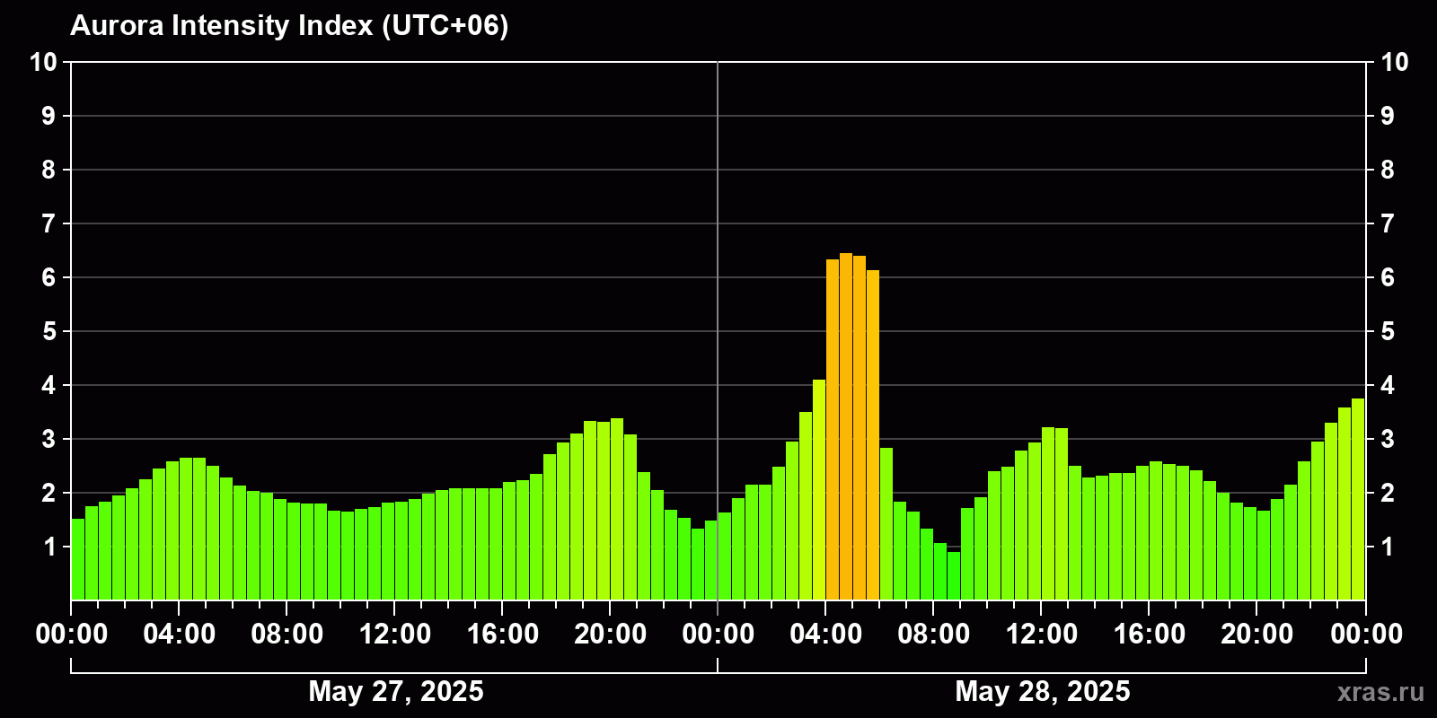 Changes in the auroral intensity index from 2025-05-27 to 2025-05-28 local time