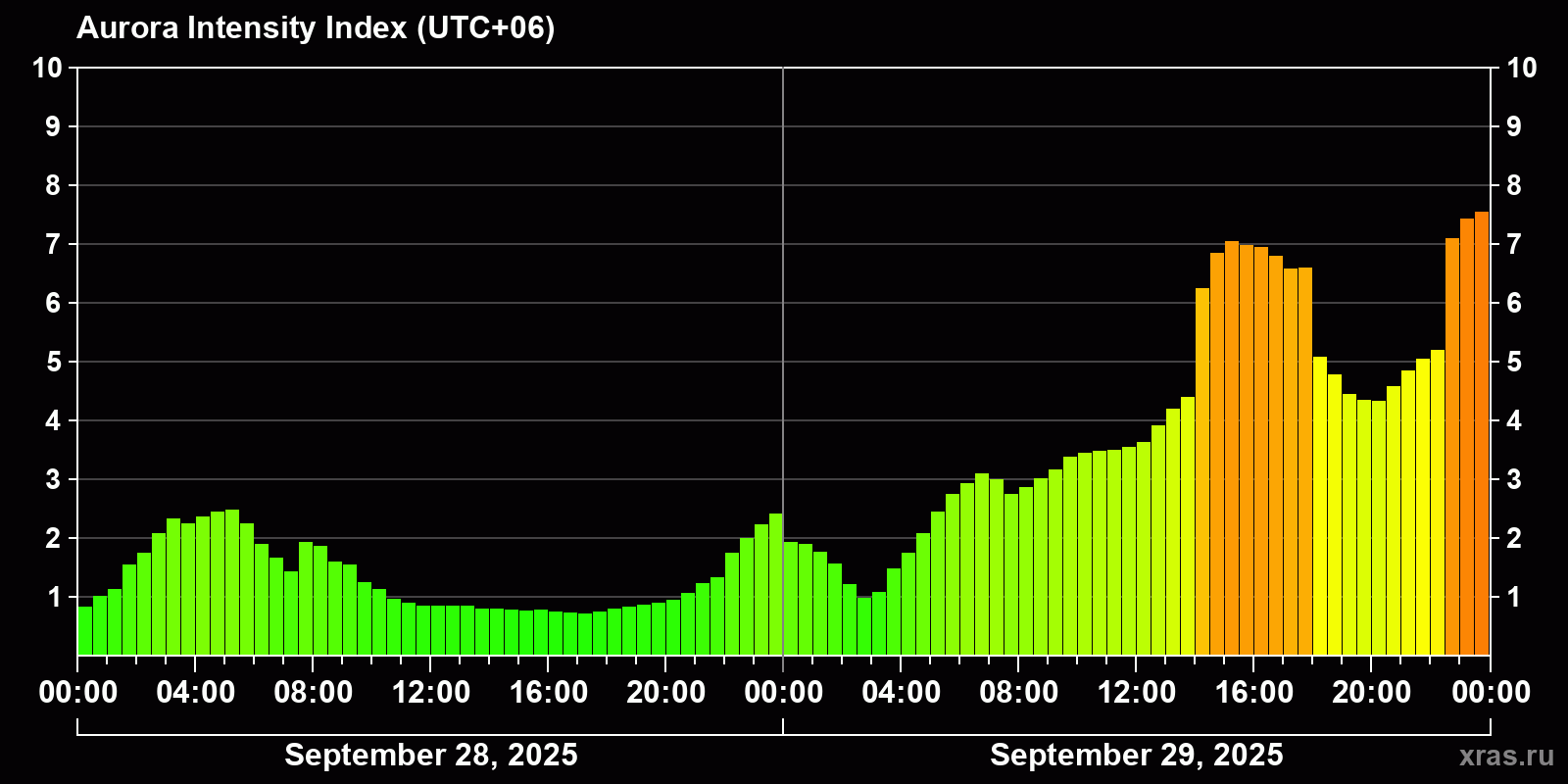 Changes in the auroral intensity index from 2025-09-28 to 2025-09-29 local time