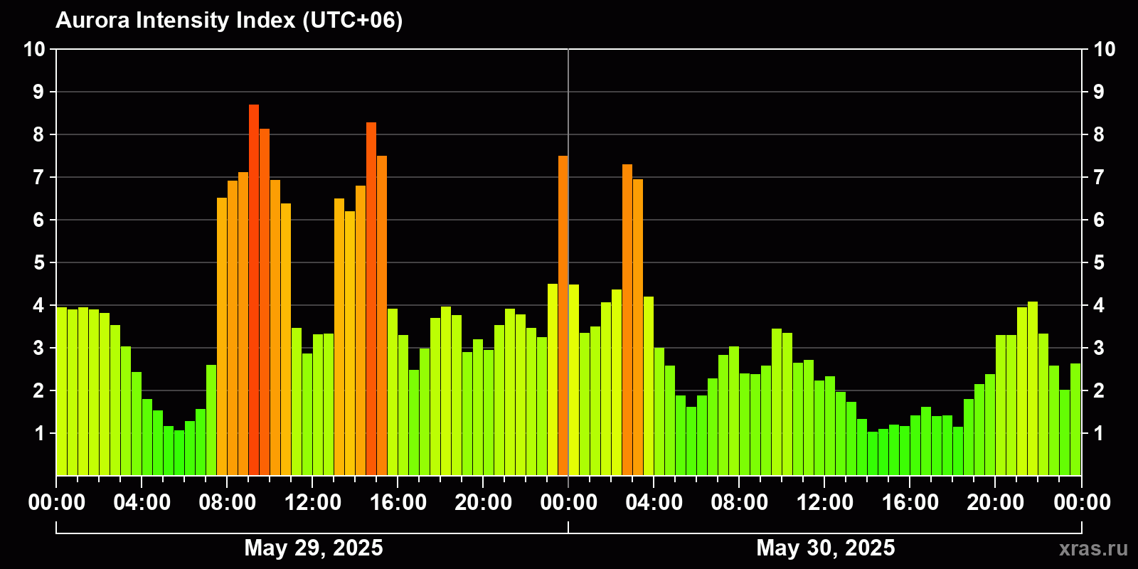 Changes in the auroral intensity index from 2025-05-29 to 2025-05-30 local time