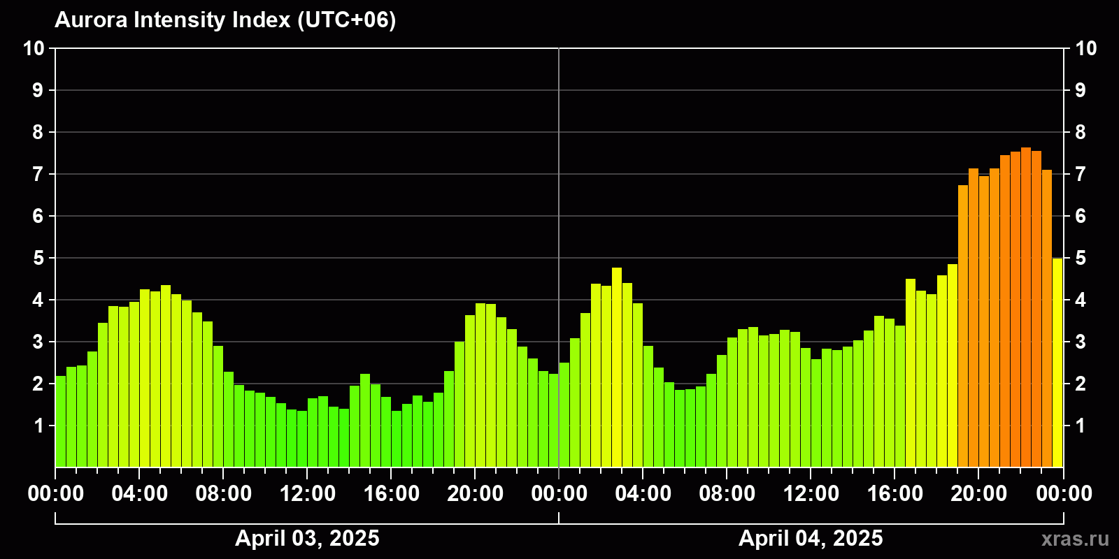Auroral intensity index and the theoretically possible latitude of observations for nighttime in the Estern Hemisphere as of 2025-04-04 23:48 (end of day) local time