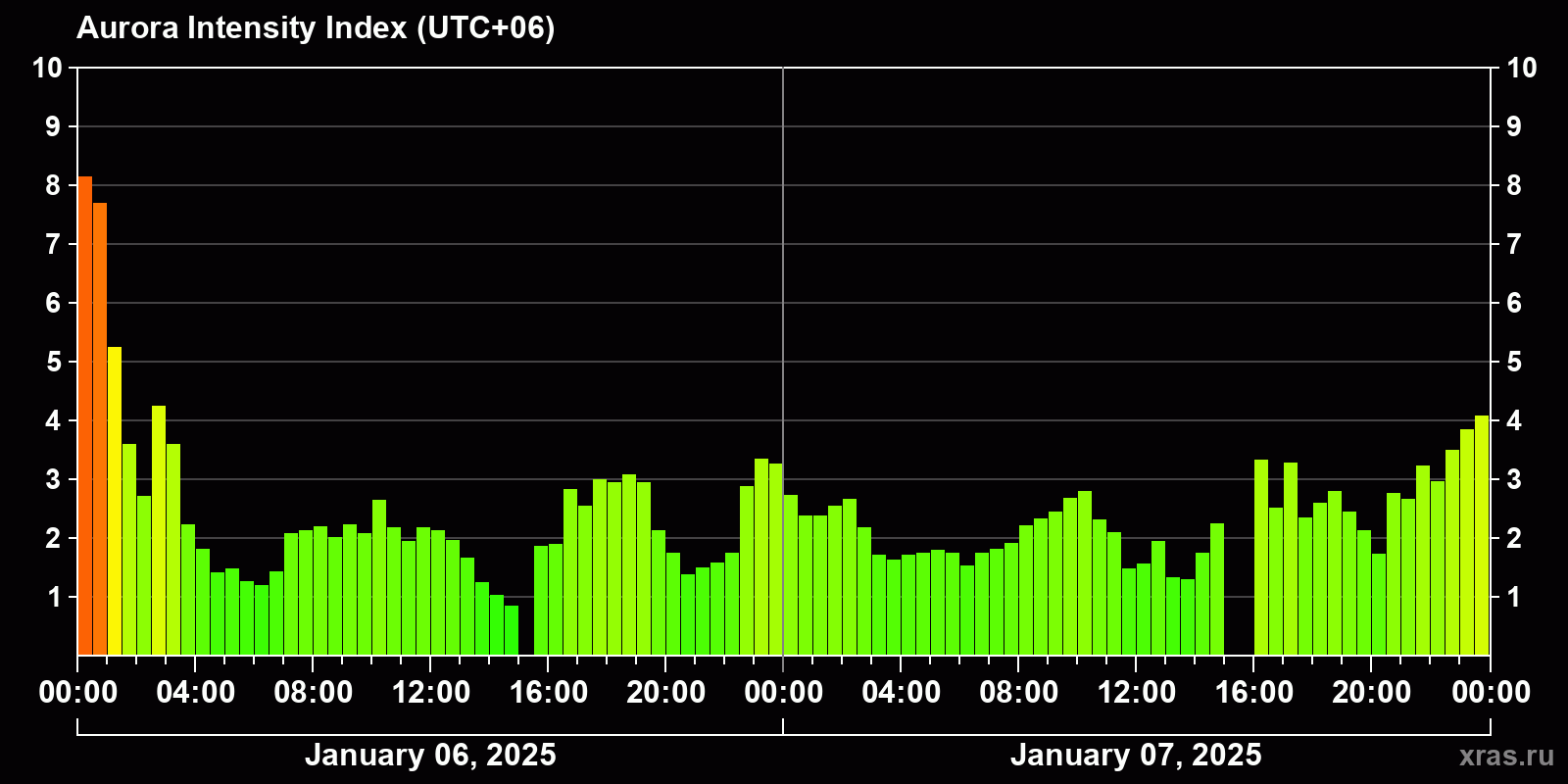 Auroral intensity index and the theoretically possible latitude of observations for nighttime in the Estern Hemisphere as of 2025-01-07 23:58 (end of day) local time