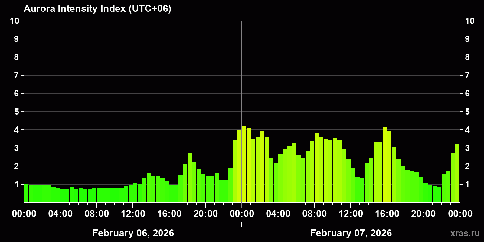 Auroral intensity index and the theoretically possible latitude of observations for nighttime in the Estern Hemisphere as of 2026-02-07 23:57 (end of day) local time