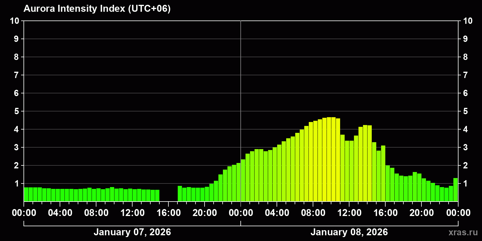 Changes in the auroral intensity index from 2026-01-07 to 2026-01-08 local time