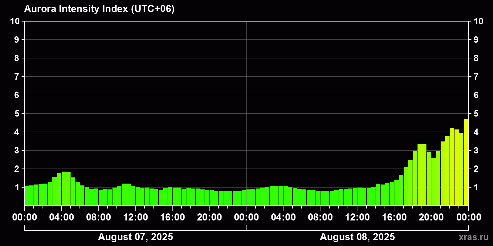 Auroral intensity index and the theoretically possible latitude of observations for nighttime in the Estern Hemisphere as of 2025-08-08 23:51 (end of day) local time