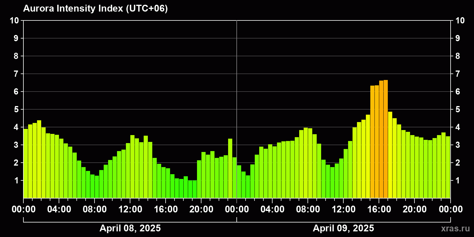 Auroral intensity index and the theoretically possible latitude of observations for nighttime in the Estern Hemisphere as of 2025-04-09 23:45 (end of day) local time