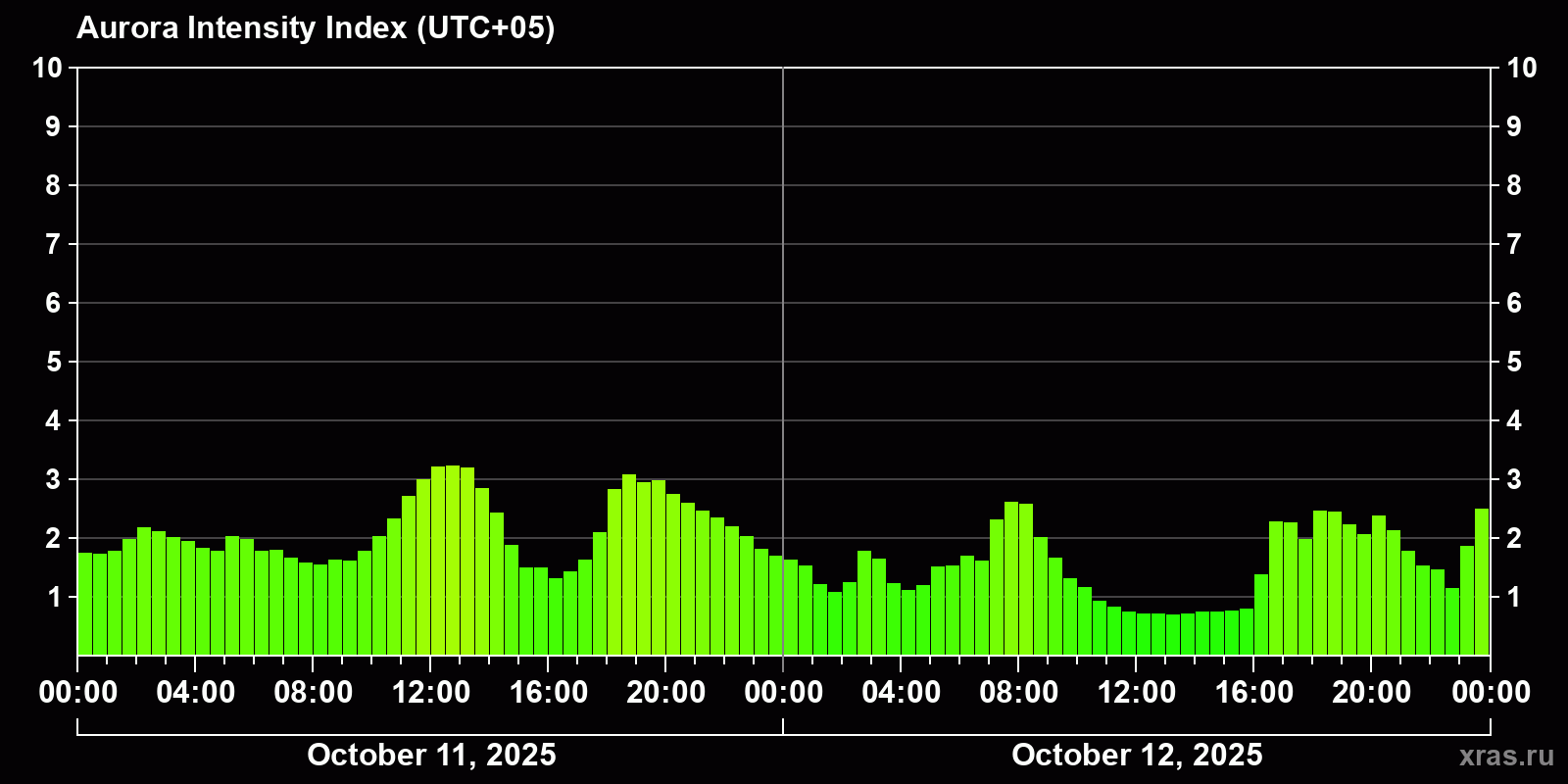 Changes in the auroral intensity index from 2025-10-11 to 2025-10-12 local time